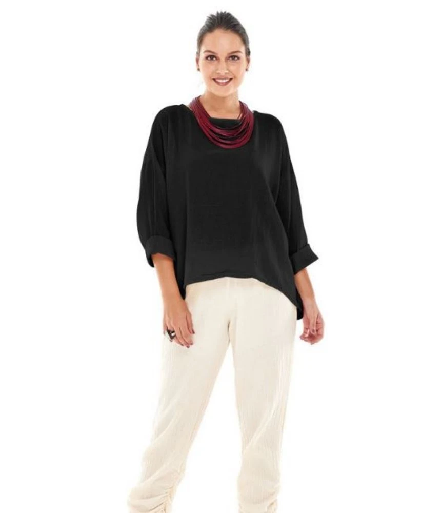 A classic and popular long sleeve cotton pullover top that can be dressed up or dressed down. Features a back drop hemline and jewel neckline that is perfect for pairing a necklace with. Wear it with trousers or jeans and some mules. 100% cotton.