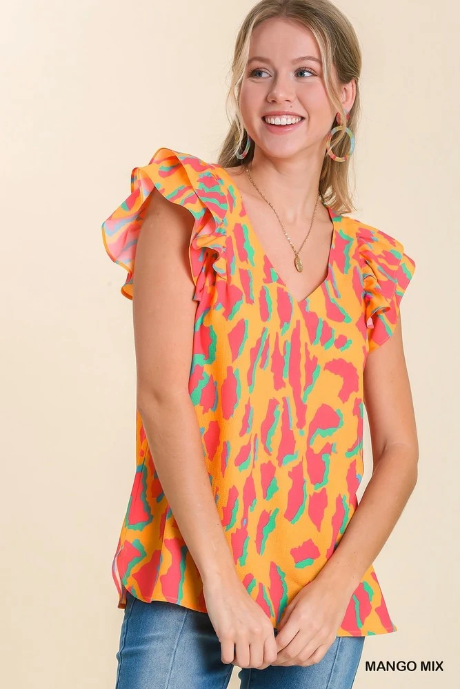 This abstract print top features a v-neck neckline and double layer ruffle sleeves. A flowy fit that lays nicely on the midsection and conceals any unwanted lumps and bumps. Pair with white jeans or shorts. 100% Polyester