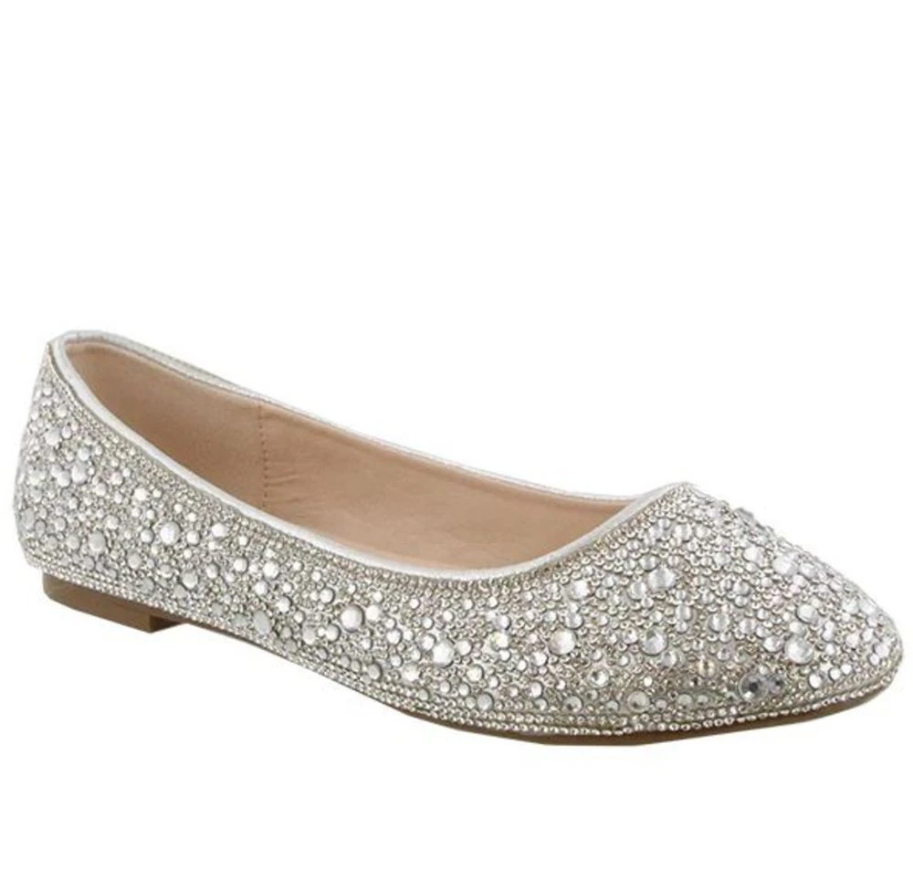 Step out in this gorgeous flat. Features a closed toe design with rhinestones. Easy slip on style that can be worn with jeans or a dress.