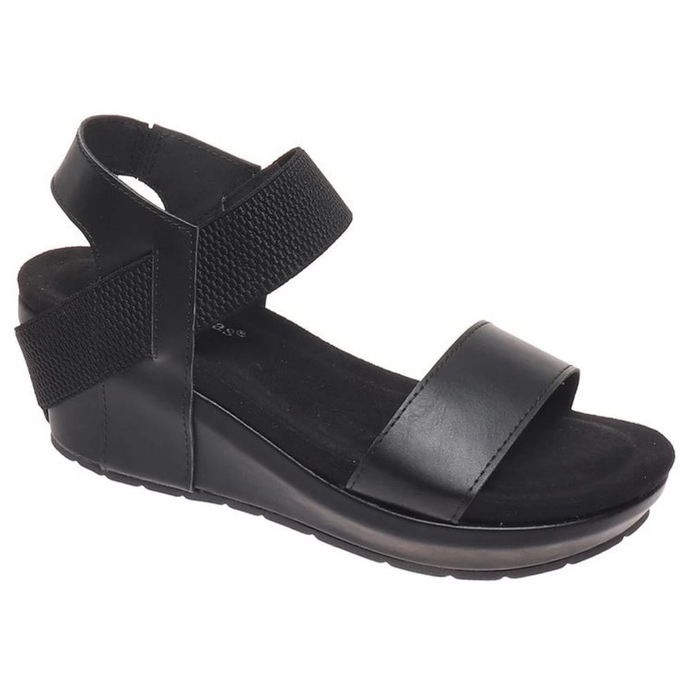 This wedge sandal features a faux leather upper and comfortable elastic strap. An easy slip-on style with no buckles necessary. 2.5 inch heel for the perfect boots. Pair with a skirt, jeans, or a dress.