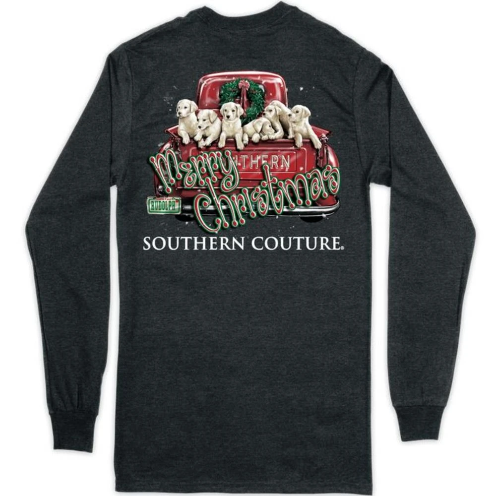This adorable long sleeve tee features puppies in a truck and `Merry Christmas` across the graphic. Round neckline a comfortable fit. Pair with jeans, leggings or sweatpants on a comfy day at home.