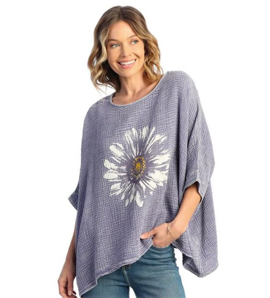This cute and flowy daisy top features a relaxed silhouette and elbow length sleeves. Round neckline and draped hemline. Pair with jeans and slip ons. 100% Cotton