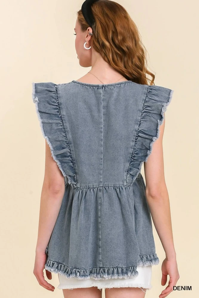 This feminine babydoll top features flutter sleeves and a frayed ruffle hem. A v-neckline and flowy fit flatters the torso. Pair with a skirt or shorts and some sandals. 80% Cotton 20% Polyester