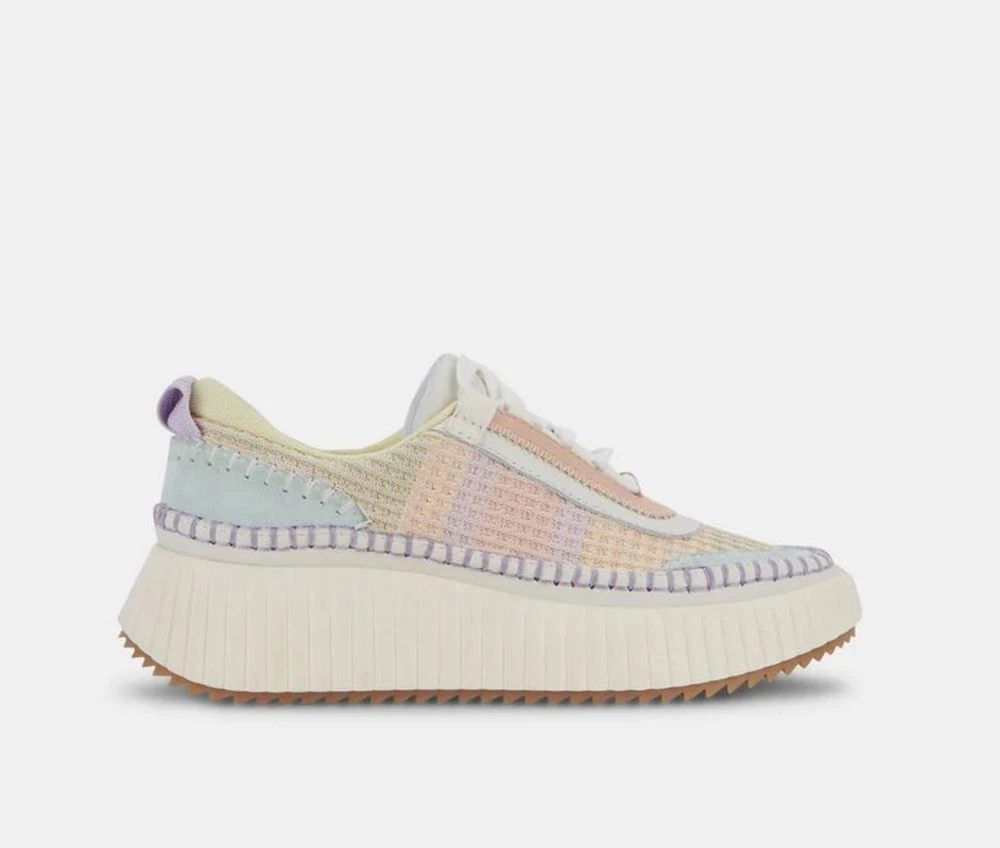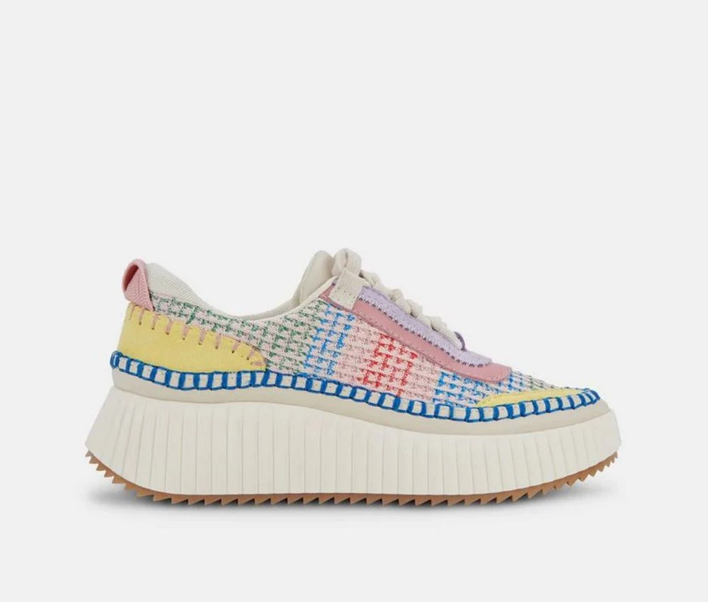 A new spring sneaker for all the stylish sneaker lovers. The Dolen features a suede and woven knit upper and gorgeous pastel colors. A bouncy, rubber platform and 1.6 inch platform for a little boost. Lace up closure and textile lining. Pair with a dress or shorts.