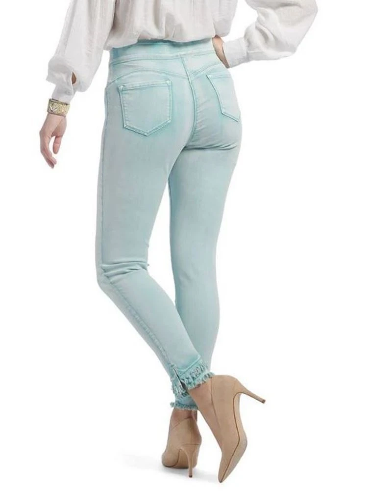 Add a little fringe to your wardrobe is these colorful skinny jeans with double fringe hems. Features a pull-on style with no buttons or zippers. OMG technology hold you in and lifts you up. A wide elastic slims the midsection. 28` inseam. Materials: Cotton/Viscose/Polyester/Spandex.