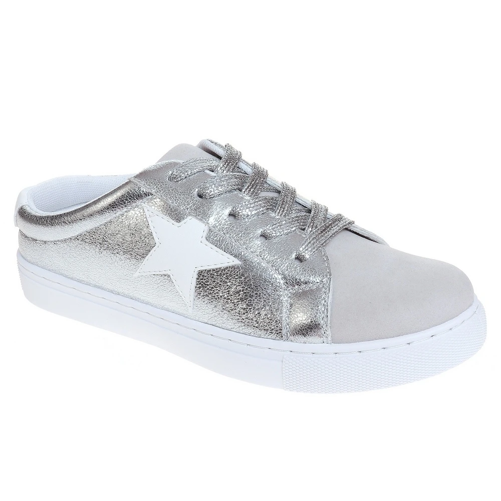 These adorable silver sneakers are the perfect shoe to slip into for a long day of errands. Detailed with a star and silver foil fabric on the body of the shoe and a suede toe, these shoes are one of a kind.