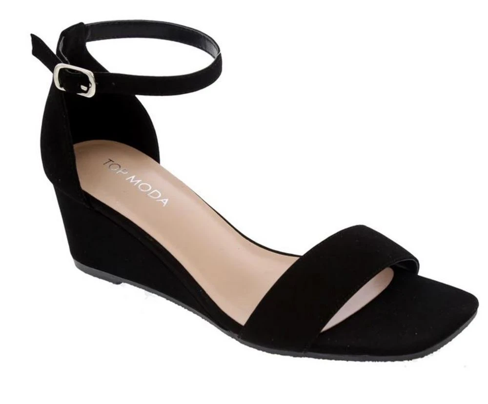 A strappy wedge heel that can be worn to your next dressy event. Features a faux leather nubuck upper and wedge heel height of 1.8 inches. Ankle buckle closure that is adjustable to the perfect fit for you. Square toe.