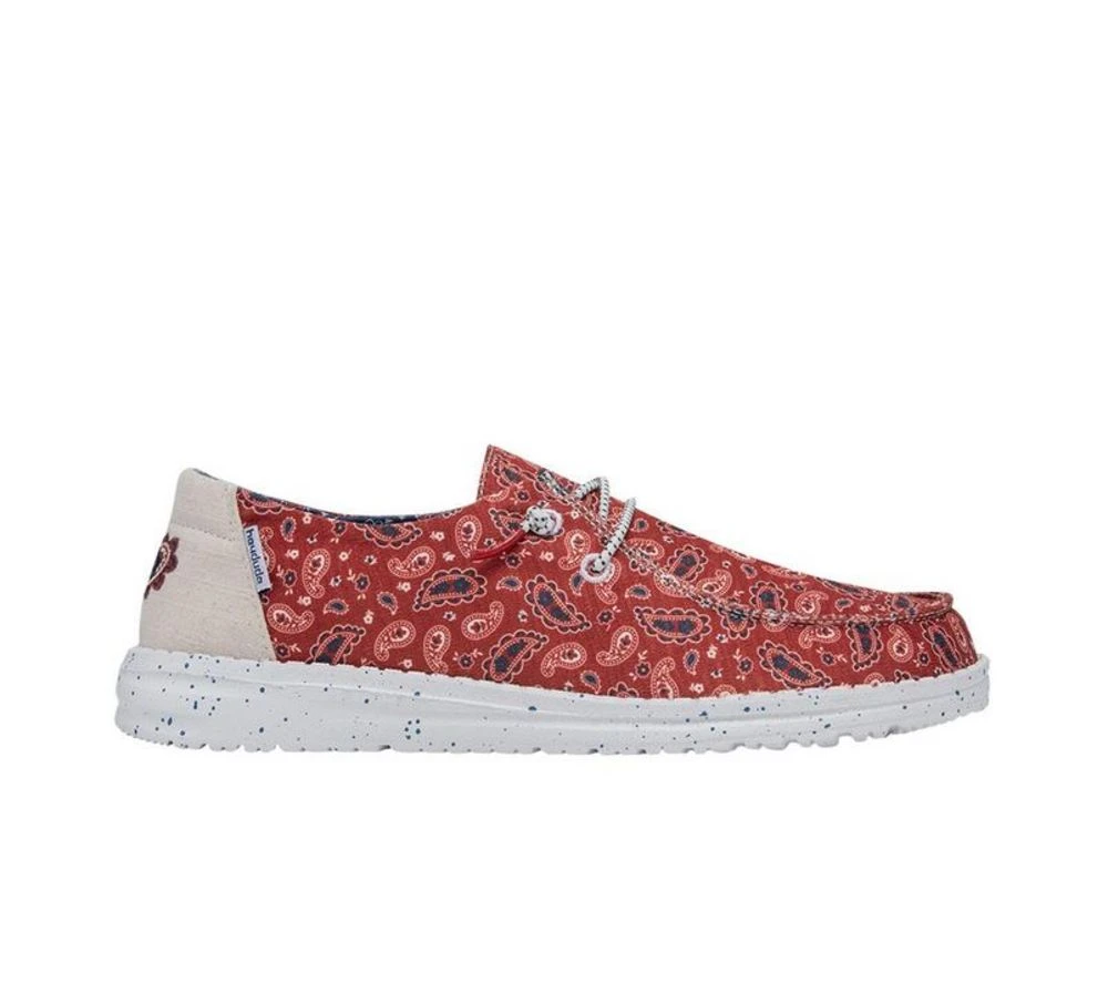 These patriot Hey Dude`s feature a memory foam insole and ultralight outsole. Easy slip on style with no-tie elastic lacing. Canvas upper and leather-lined. Perfect for the Fourth of July or any summer day.