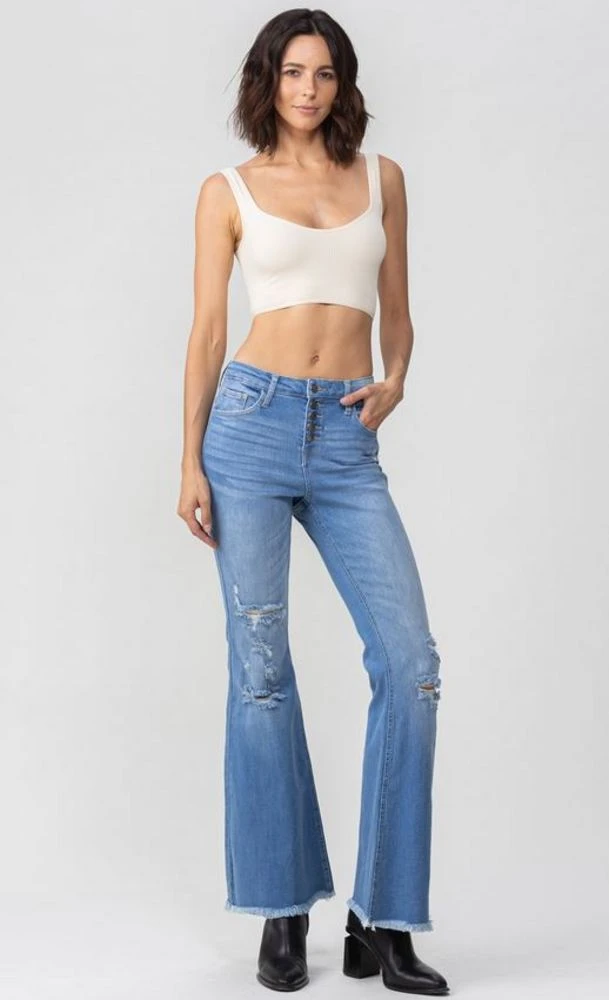 This classic flare jeans features a high rise fit and flattering flared design. Slimming on the legs, perfect for an elongated look with heels. Five pockets and stretchy in all the right places. 93% Cotton 5% T400 2% Spandex