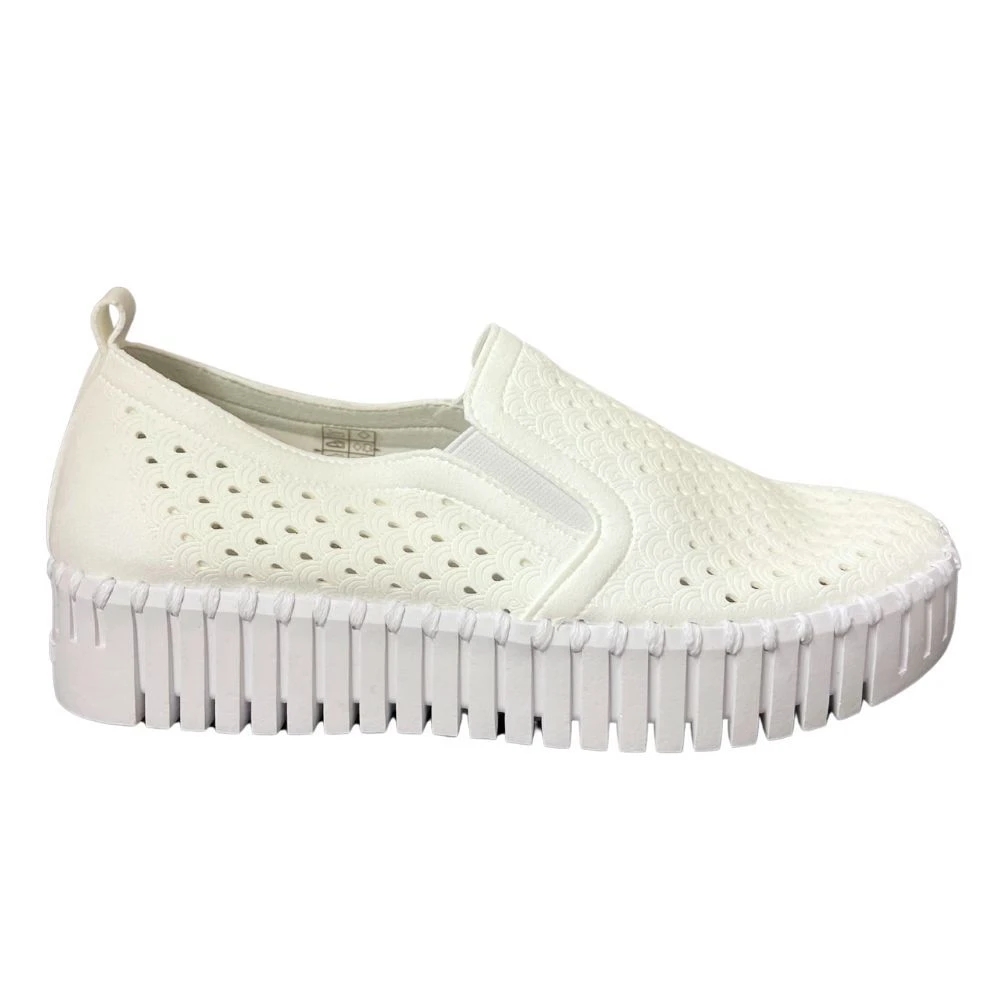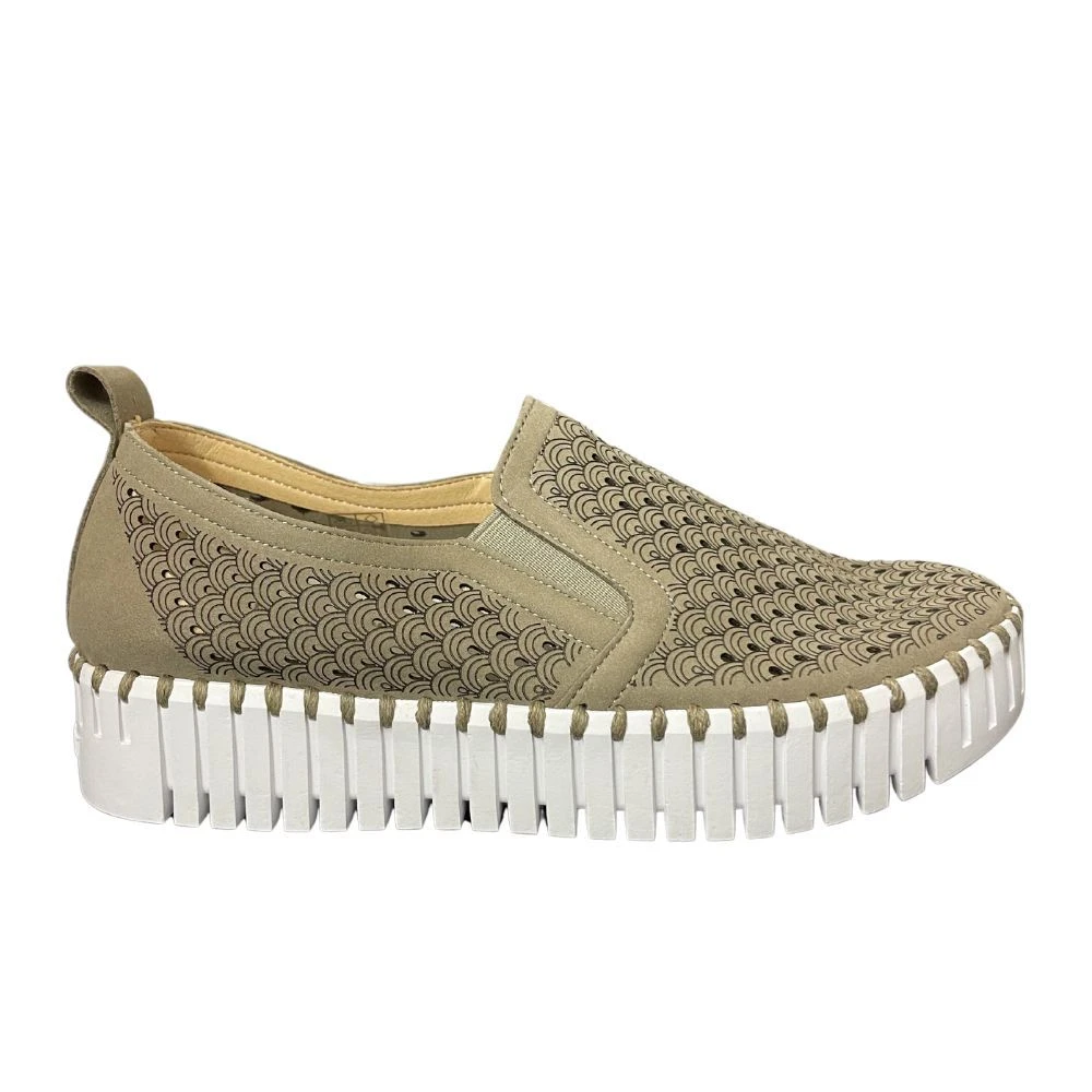 Slip them on and slip them right off, these cute shoes are perfect for a day of errands or relaxing. The small hole pattern enables your feet to breath and keep cool during the day. Nubuck upper, rubber sole and removable leather insole. 1 1/3 inch platform.