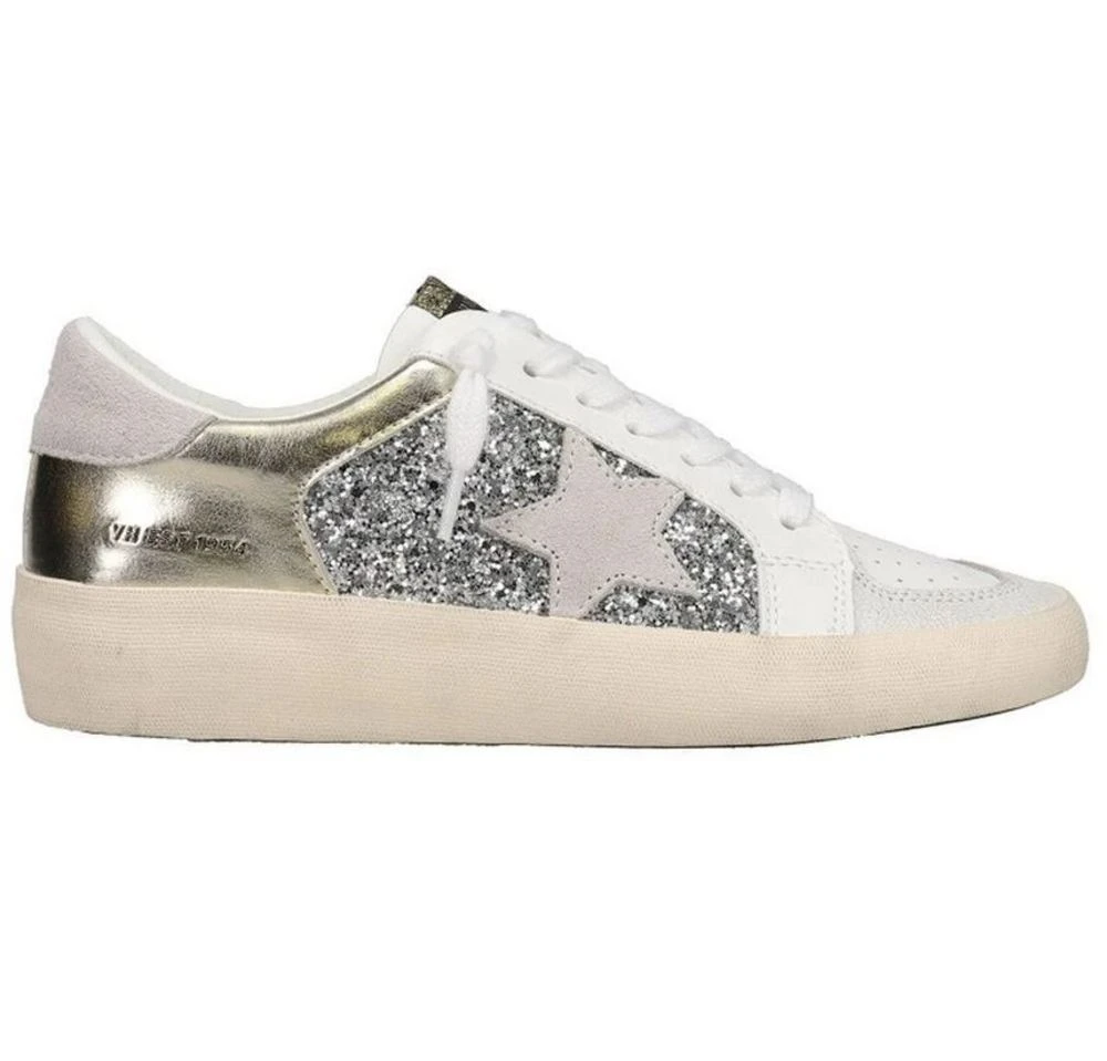 The Libby is sure to be a showstopper. this fashion sneaker features a no tie closure and leather upper/suede heel. Glitter and star embellishments on side of shoe. Pair with a dress or shorts.