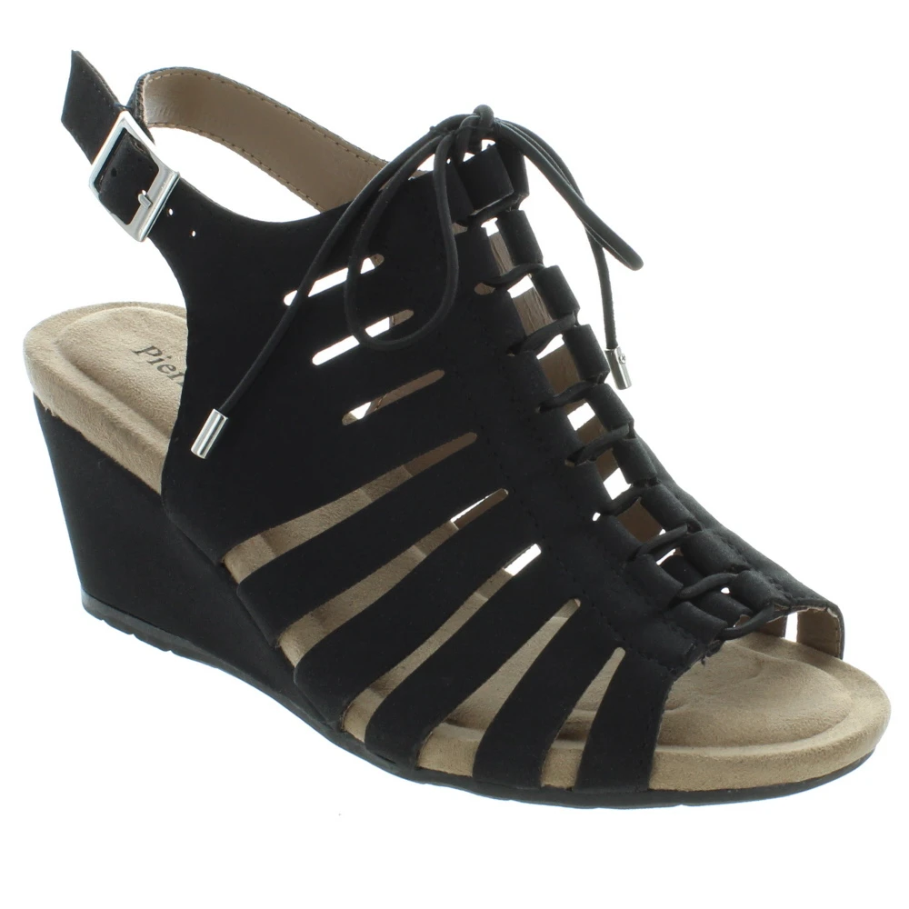 MALINA-2 has a nubuck upper with laser cutouts, stitching and elastic lacing up the front. The adjustable buckled strap behind the heel provides access, while memory foam padding will make these heeled sandals extremely comfortable. The covered wedge heel is almost 3 inches high.