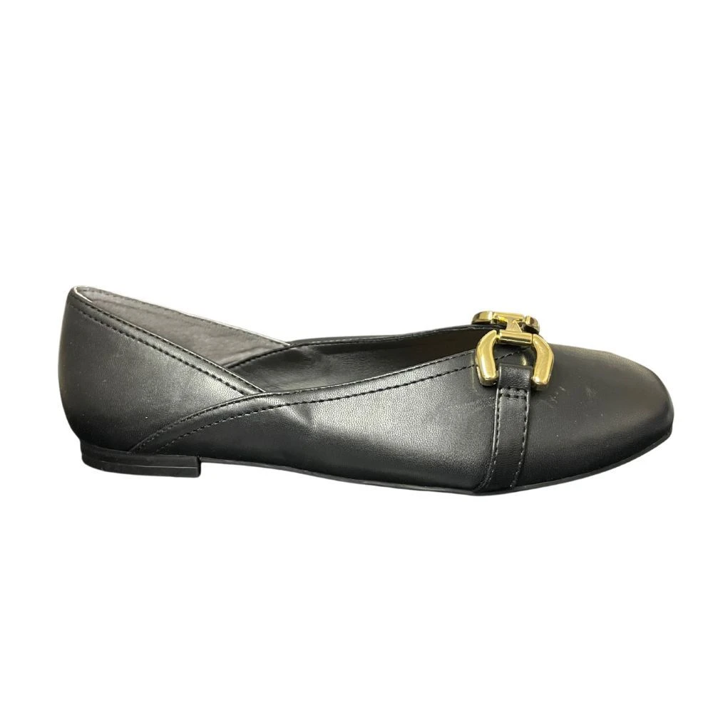 This simple ballet flat features a slip-on style, perfect for those who are on-the-go. Gold buckle embelishment on upper toe of shoe and a padded footbed for all day comfort.
