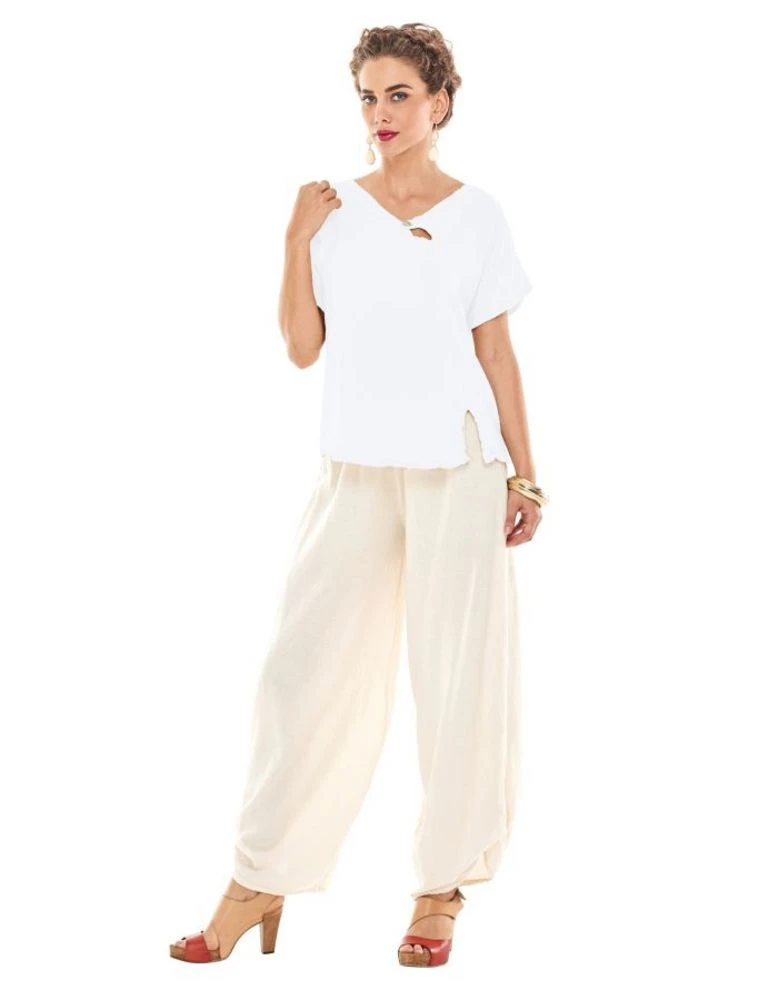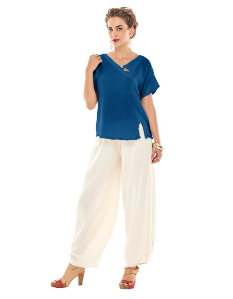 Perfect for a petite frame, this shorter top features a v-neck button neckline and from hem slit detail. Wear it with some flowy pants or pair it under a jacket. 100% cotton.