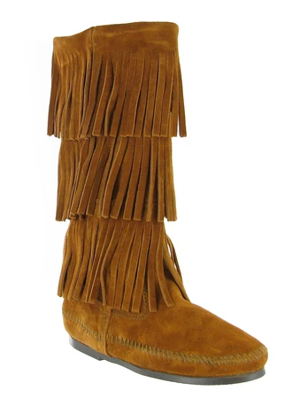 This boot features Suede upper/crepe sole and three tiers of fringe cover the tall shaft.