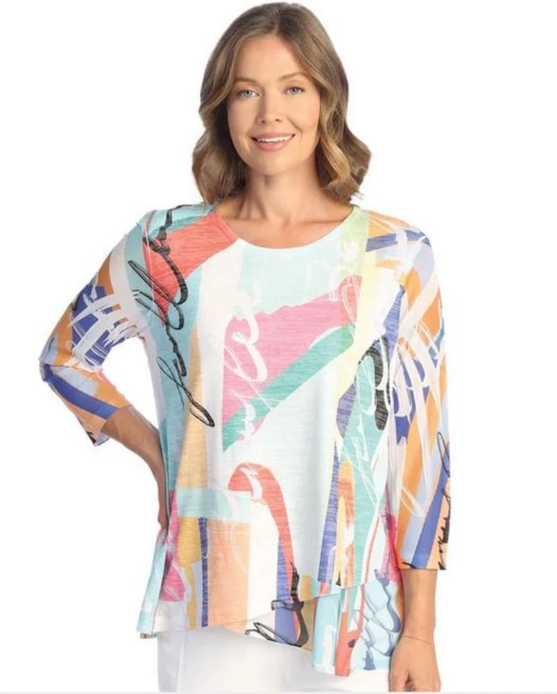 This abstract print burnout tunic top is perfect for the Spring. Features a round neckline and a mesh contrast hemline. Super lightweight fabric that will keep you cool and 3/4 length sleeves. Pair with white or denim jeans and some slip ons. 50% Cotton, 50% Polyester.
