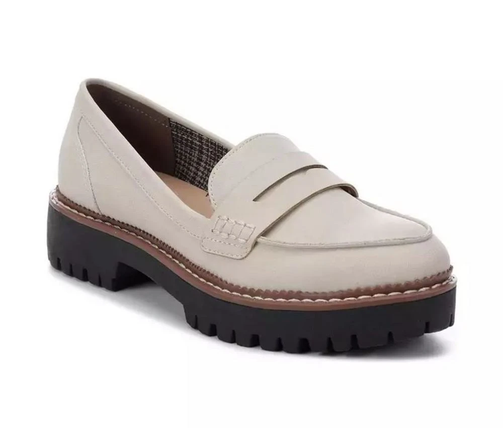 This stylish loafer can be dressed up or dressed down. Features a synthetic leather upper and easy slip-on design. Almond moc toe with subtle stitching details. Rubber midsole and lugged outsole with a 1 1/2 inch heel.