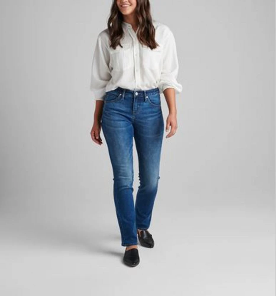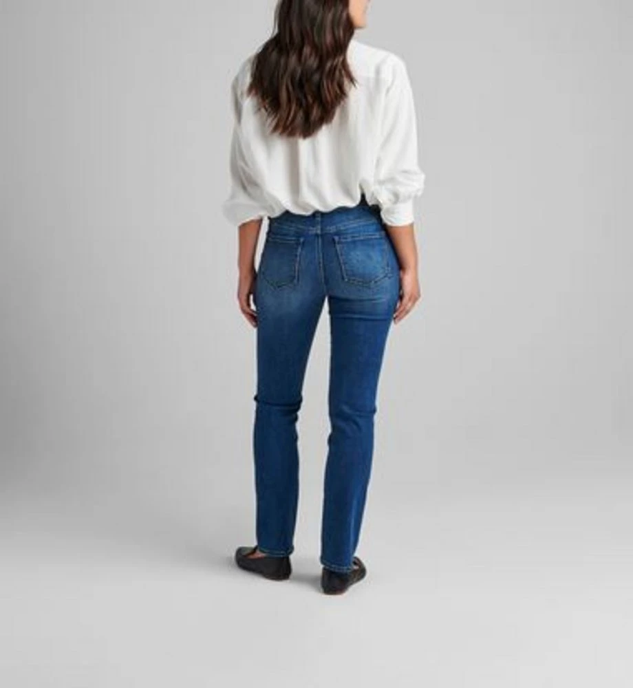 These straight leg jeans smooth, supports and lifts. Interior elastic at the waist holds you in and a narrow waistband prevents gapping. Mid rise and made in comfort stretch crosshatch denim that`s extremely soft for all-day wear. Classic pockets and a medium-dark wash. 9.75` mid rise. Fiber content: 93% Cotton 6% Polyester 1% Elastane.
