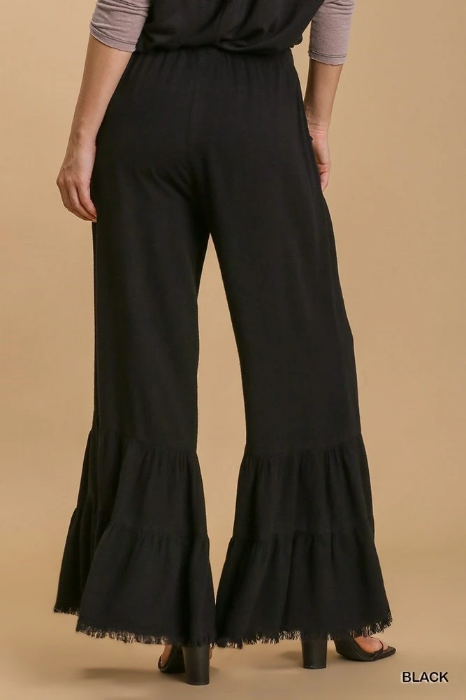 These fun, wide leg pants feature cute ruffle detail and two side pockets. Frayed hem and comfortable elastic waistband. Pair with a flowy top and sandals. 55% Linen 45% Cotton