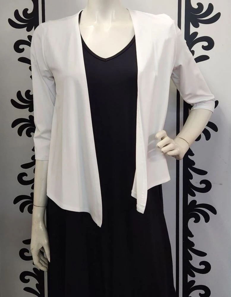 The perfect lightweight piece to layer over a dress or top. Features an open front that can be worn open, tied in the front, or as a crossover top that ties in the back. Elbow length sleeves and a flowy, boxy fit.