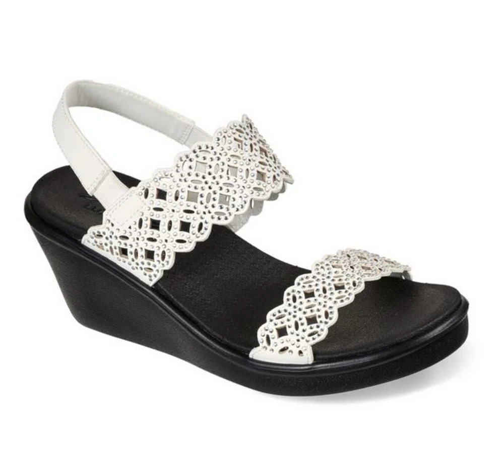 This fashionable wedge sandal is not only stylish, but also functional. Features a slingback strap and rhinestone embellished scalloped synthetic strap. Cushioned Luxe Foam footbed will keep your feet comfy all day long. 3-inch wedge.