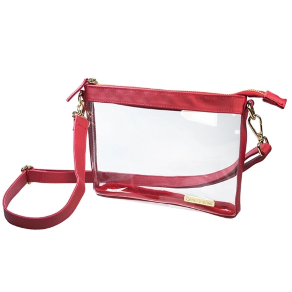 Our crossbody features a clear PVC body with classic accents of Vegan Leather and gold hardware. The main zippered compartment is perfect for securely storing your personal items. Easily convert your accessory from a crossbody to a clutch with the adjustable and detachable Vegan Leather strap. Measures 8` x 6β x 1.6`