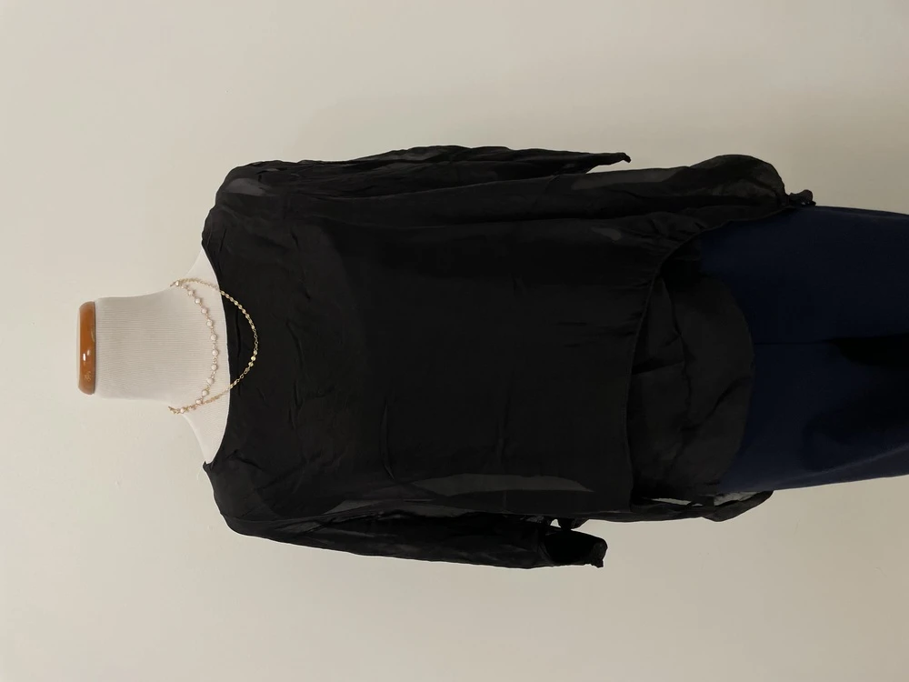 Complete any outfit with this silk top. Features a round neckline and flowy sleeves. Built in tank under a sheer top that flows away from the body, concealing any lumps or bumps. Pair with black or white skinny jeans for a sleek look.