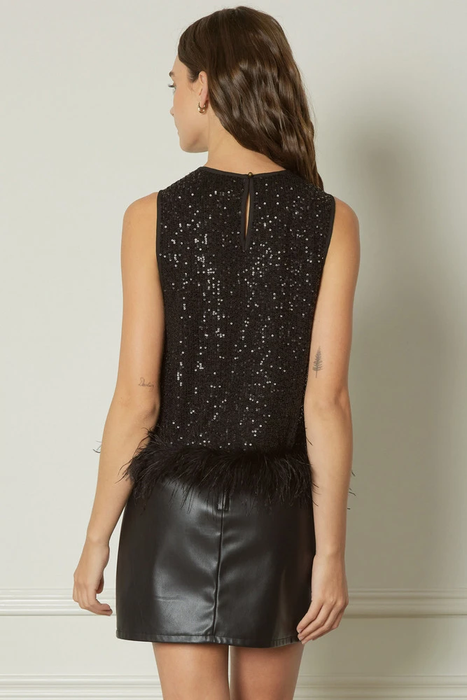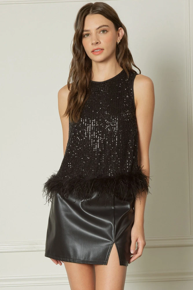 The holidays are right around the corner and this sparkley top is perfect for a special event. Features a round neckline and sleeveless style. Fun feather trim and a back key hole closure. Super lightweight, woven, non-sheer and lined. Pair with a skirt or some black slacks. 96% POLYESTER 4% SPANDEX
