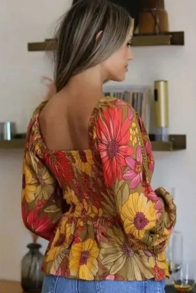 This adorable sunflower top screams warm summer days. Features crochet long sleeves and a sweetheart neckline. A flowy peplum style that pairs perfectly with skinny jeans and sandals.