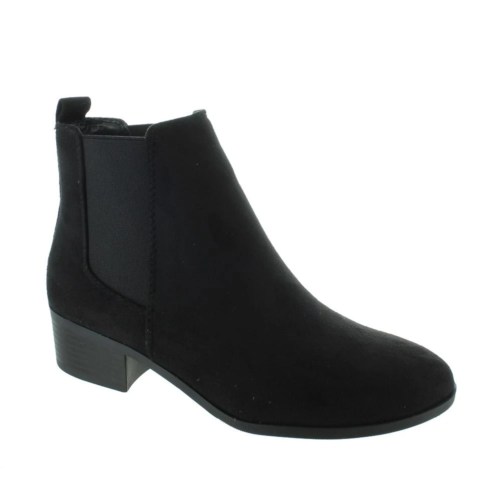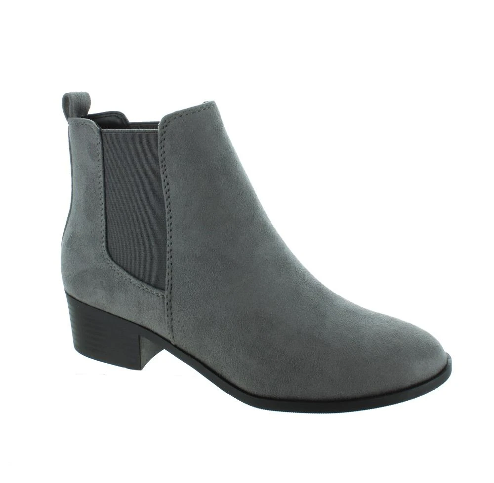 A fashionable ankle boot with a stretch insert for easy pull-on. It features a grey suede upper, 1.5-inch heel, and black bottom sole. Plus, the slightly pointed toe is trendy and edgy.