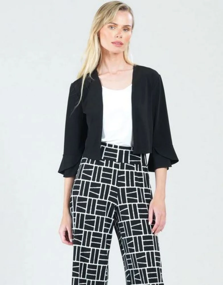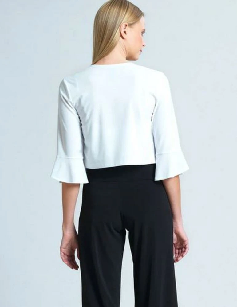 This adorable, cropped tulip cuff shrug is the perfect layering piece. Features an open front and elbow-length cuffed sleeves. A cropped hem design hits right above the waist. Cooler than linen or cotton and made from soft stretch poly blend fibers.