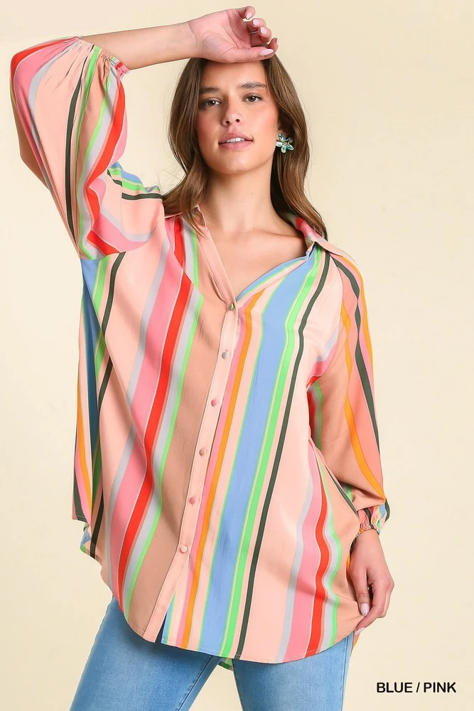 Adorable mixed print button up tunics for warm days. Features a collar neckline and 3/4 length puff sleeves that will make you feel like a princess. Ruched back detail and a light and flowy fit that pairs well with a fitted pant or shorts. 100% Polyester.