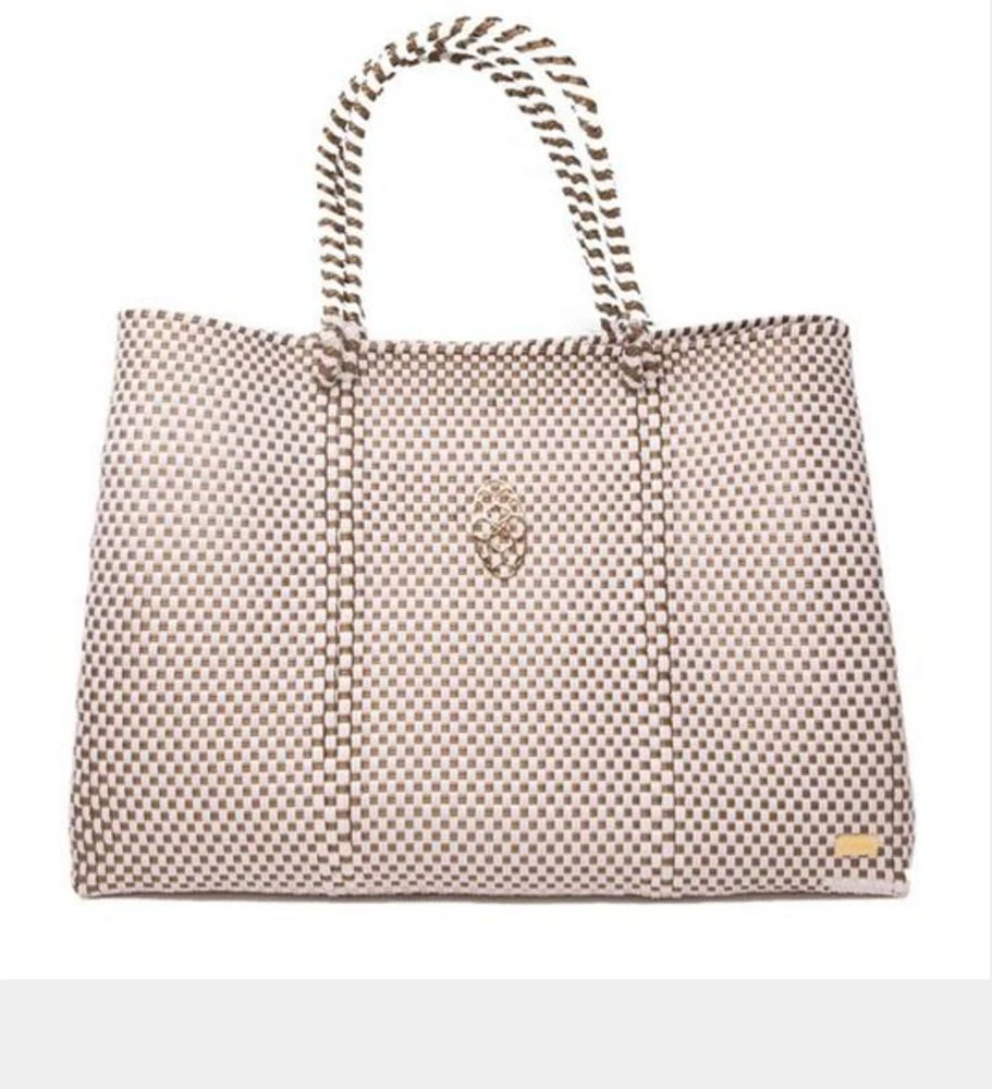 Handmade woven plastic tote with 24K Gold Plated Signature Medallion and Lola`s brand name plate.