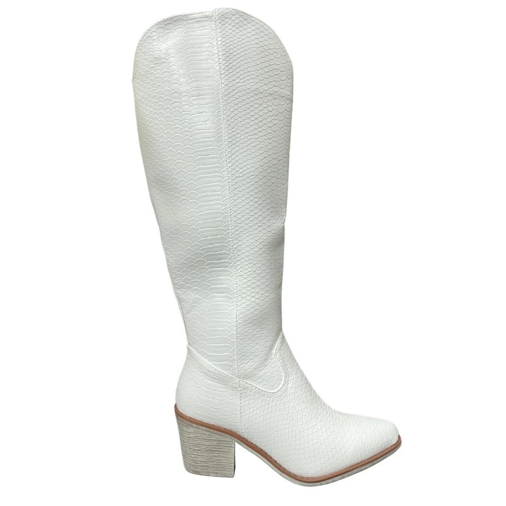 Add these Western white boots to you collection. Features a western style silhouette and block heel. Snake print design and faux leather upper. A pointed toe and cushioned footbed that will keep your feet comfortable all day. 2 inch heel.