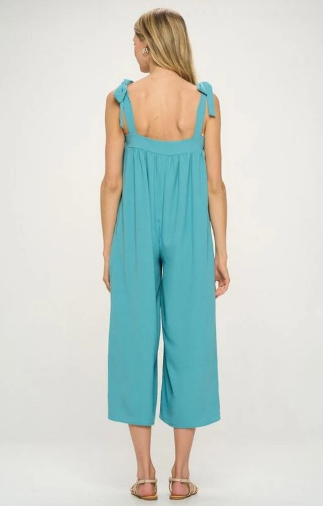 This light and flowy jumpsuit features a sleeveless design and tie straps. Sweetheart neckline and two side pockets for convenience. Pair with heels and sandals. 100% Polyester