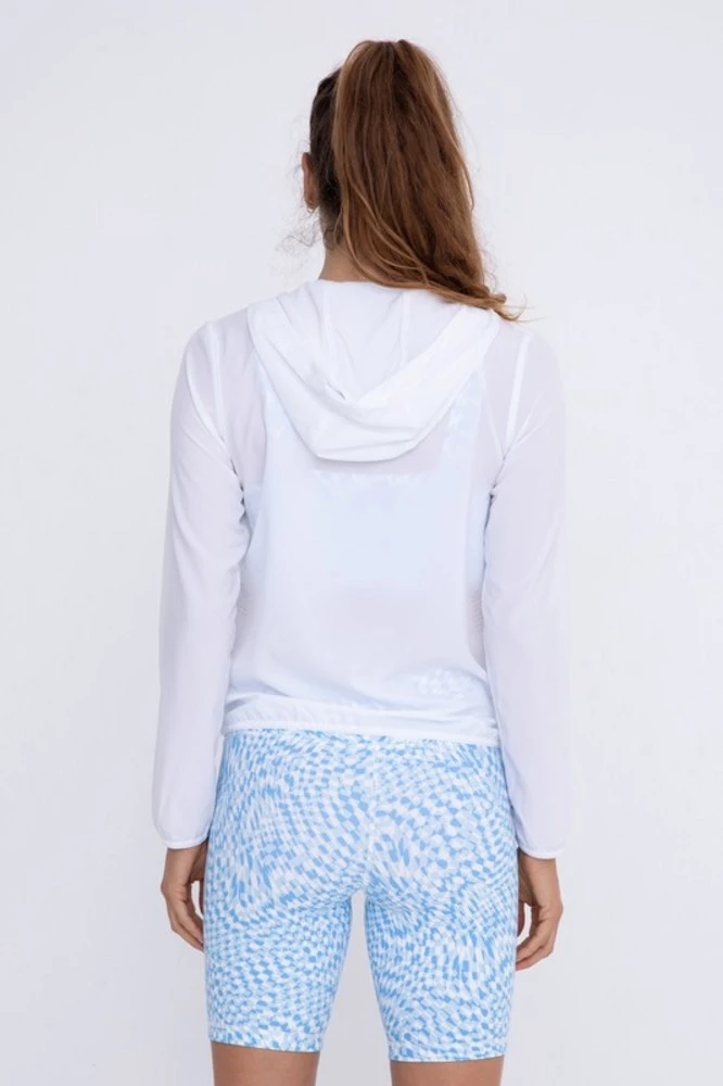 Take a jog in this super lightweight jacket. Features two side pockets and a zipper closure. Laser cut panels for brethability and a hood. 90% polyester 10% spandex